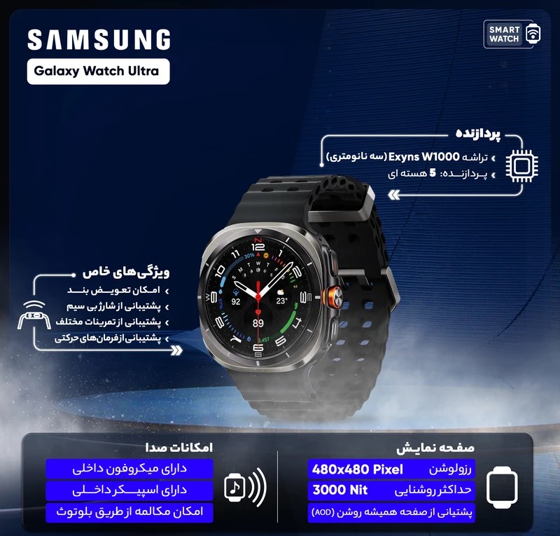 Samsung Galaxy Watch 7 Ultra یک ساعت هوشمند کامل و پیشرفته است که در طراحی و امکانات خود نشان از توجه ویژه سامسونگ به نیازهای کاربران دارد. مجموعه قدرتمندی از سختافزار، سنسورها و قابلیتهای نرمافزاری در این ساعت به کار گرفته شده است تا تجربه کاربری همهجانبهای را فراهم کند. نمایشگر با کیفیت بالا، باتری با قابلیت شارژ سریع و شارژ بیسیم، مجموعه گستردهای از سنسورهای پیشرفته و سیستمعامل کارآمد Wear OS همراه با رابط کاربری One UI، از جمله ویژگیهای برجسته این ساعت هوشمند هستند. علاوه بر این، بهرهگیری از هوش مصنوعی Galaxy AI نیز به طراحی تجربه کاربری هوشمندانه و سفارشیشده کمک میکند. در مجموع، Samsung Galaxy Watch 7 Ultra نه تنها یک ساعت زیبا و باکیفیت است، بلکه با ترکیب هوشمندانه امکانات پیشرفته خود، به یک همراه قابل اعتماد و مفید در زندگی روزمره تبدیل میشود. این ساعت میتواند نیازهای متنوع کاربران را در حوزههای مختلف مانند سلامت، ورزش و سبک زندگی فعال به خوبی برآورده سازد.